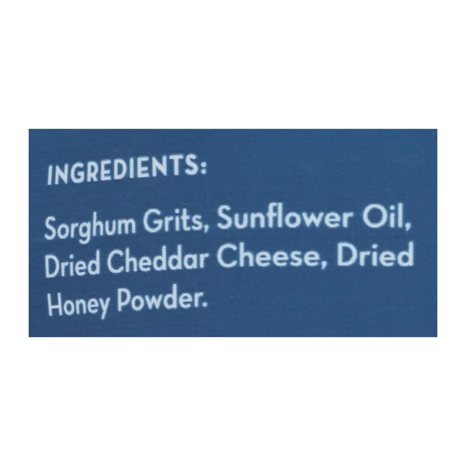ingredients : sorghum grits;ground rice;sunflower oil;dried cheddar cheese;dried honey powder;mixed tocopherols (a preservative);rosemary extract