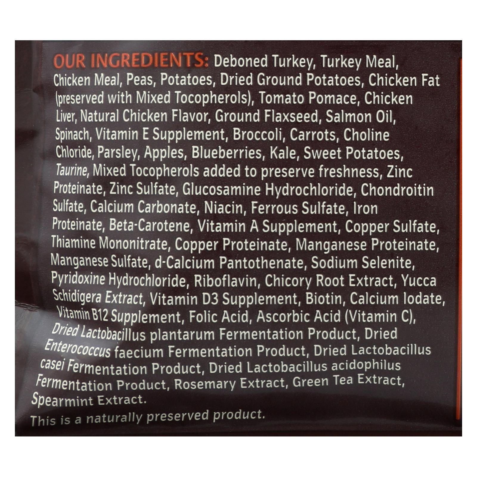 ingredients : deboned turkey;turkey meal;chicken meal;peas;potatoes;dried ground potatoes;chicken fat;preserved with mixed tocopherols;tomato pomace;chicken liver;natural chicken flavor;ground flaxseed;salmon oil;spinach;vitamin e supplement;broccoli;carrots;choline chloride;parsley;apples;blueberries;kale;sweet potatoes;taurine;mixed tocopherols added to preserve freshness;zinc proteinate;zinc sulfate;glucosamine hydrochloride;chondroitin sulfate;calcium carbonate;niacin;ferrous sulfate;iron proteinate;beta-